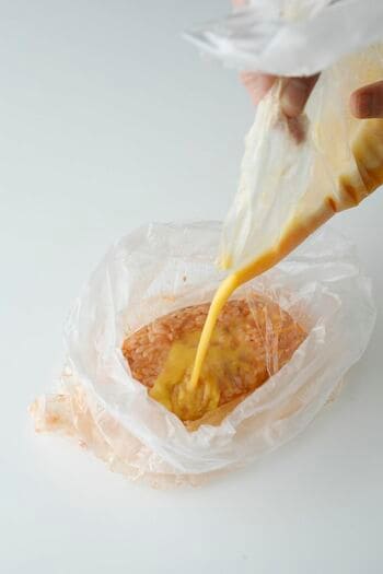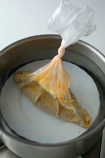 空気をしっかり抜いて口を結び、湯せんすると、水圧で形が整い、きれいなオムライスに!