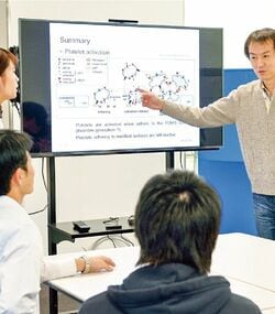 とくに、「高分子超薄膜から創成する次世代医用技術」研究は、2014年度、文部科学省の「私立大学戦略的研究基盤形成支援事業」に採択されています。新規医療技術の開発に留まらず、研究過程で得られる知見や成果は、再生医療、診断機器開発、薬剤スクリーニングや細胞病理などへの波及が期待されています。研究代表者の喜多理王・理学部教授は、「多分野の研究者間コミュニケーションの活性化に寄与し、新たな研究テーマや価値を生み出していける場にしたい。実験エリアだけでなく、コミュニケーションエリアを積極的に活用し、ランチョンセミナーや学内外の講師による講演会なども開いていきたい」と抱負を語っています。