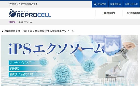 リプロセルのホームページ(HP)では「iPSエクソソーム」の特徴として、「老化した線維芽細胞(皮膚の細胞)の老化マーカーを減少させる」「線維芽細胞のコラーゲン産生量を維持する」などを挙げている。しかし根拠として示されている3本の論文はいずれも培養細胞を使った実験の成果で、動物や人に投与した結果ではない。