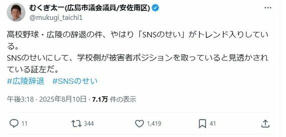 早速X(旧Twitter)では、「SNSのせい」がトレンド入りした。それを受けて、広島市議の椋木太一氏は、Xに「SNSのせいにして、学校側が被害者ポジションを取っていると見透かされている証左だ」と投稿。賛同する声が広がった。