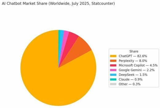 一方、他社製品と比較すると、AIチャットボットの世界シェアではChatGPTが2位以下に大差をつけて首位に立っている(図1)。