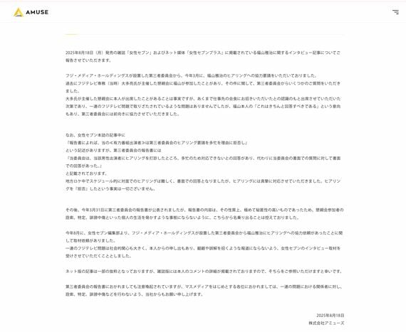 さらに、福山さんの所属事務所「アミューズ」は、公式サイトで「福山雅治に関するインタビュー記事についてのご報告」とする声明を発表している。
