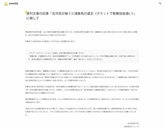 なお、アミューズは直近でも、俳優の故・三浦春馬さんと吉沢亮さんに関する「週刊文春」の報道に反論しており、所属タレントに関する報道には厳然とした態度を示している。