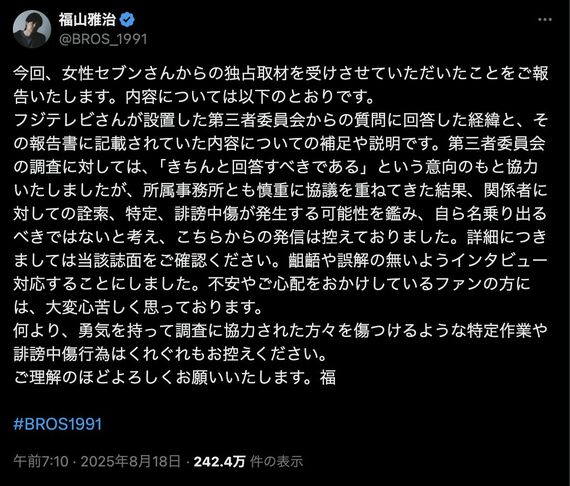 福山さんや、アミューズの対応をみても、第三者委員会の要請に対する対応が適切であったかは議論が分かれるところだが、少なくとも表沙汰になってからの対応は迅速で、適切であるようにみえる。