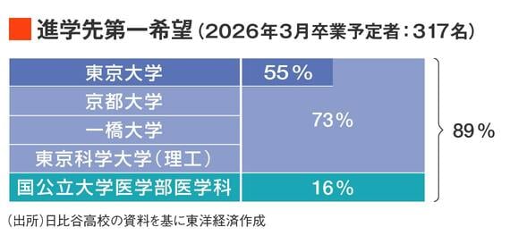 「現3年生(317人)の志望調査でも、第一志望を東大とする生徒が55%、京大・一橋大・東京科学大(理工系)を合わせると73%に上ります。国公立大学医学部医学科志望は16%で、合計89%の生徒が難関国公立大学を第一志望としています。そのため、本校では国公立大学の受験を前提としたカリキュラムを編成し、各学年3回の個人面談と1回の三者面談、各種ガイダンスなどを通じて個々の課題に応じた情報提供を手厚く行い、最後まで第一志望を諦めさせない『第一志望主義』の進路指導を行っています」