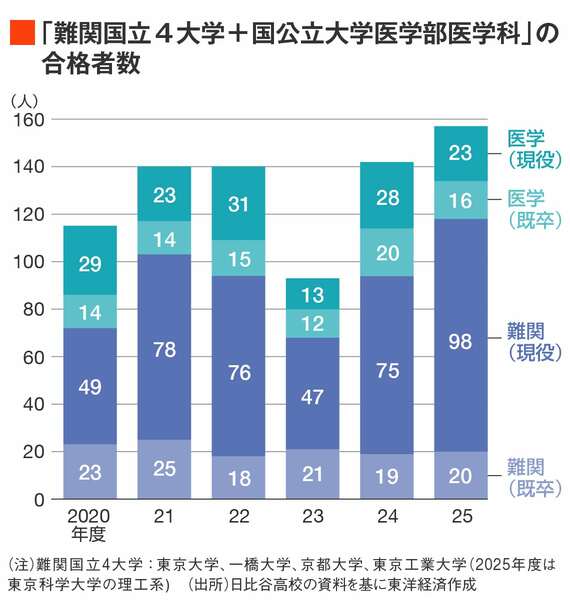 2025年度入試では、難関国立4大学(東大、一橋大、京大、東工大<2025年度は東京科学大の理工系>)と国公立大学医学部医学科の現役合格者数は121人となり、ここ数年で最も多い結果となった。