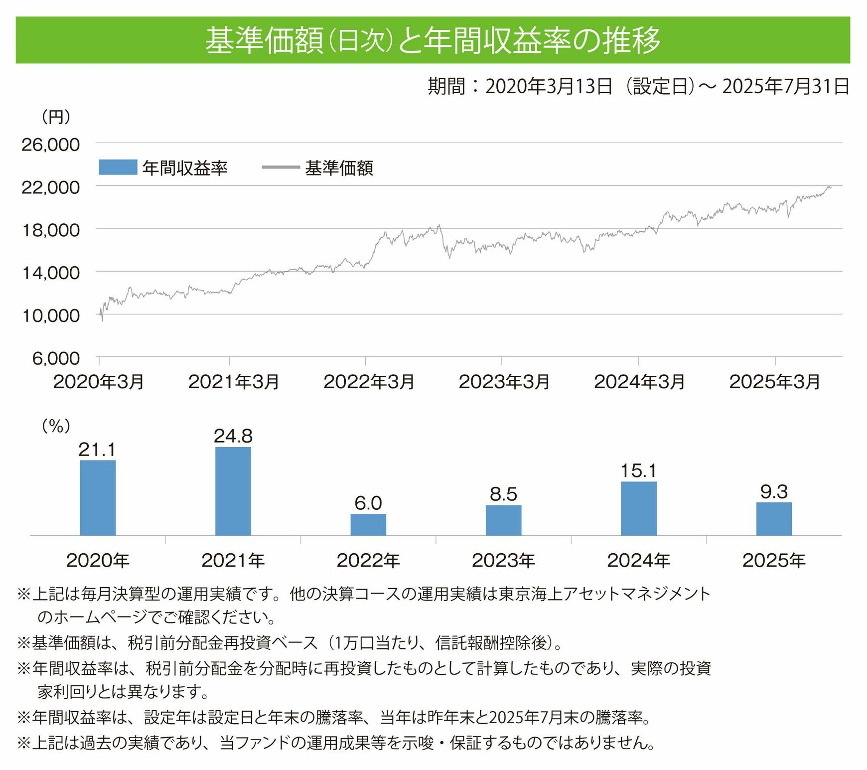 浅野氏は「モノポリー企業は、世界の経済動向に依存せず、一定の国・地域で収益を上げる構造を持っています。また、輸出関連事業ではないためトランプ政権が掲げる関税政策が及ぼす影響を受けにくいのが特徴です」と加える。短期の波に左右されにくいという性質が、改めて評価されているのだろう。実際、毎月決算型、年1回決算型、年6回決算型の3コースある「東京海上・世界モノポリー戦略株式ファンド」は、安定的な運用実績となっており、毎月決算型は設定から5年になるがすべての年でプラスリターンを記録している。また、3コースの純資産総額合計は約712億円(25年7月31日時点)にまで拡大している。