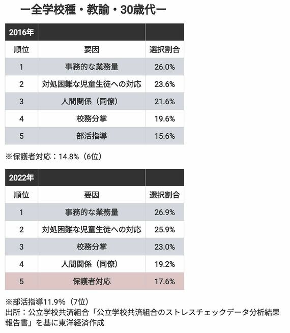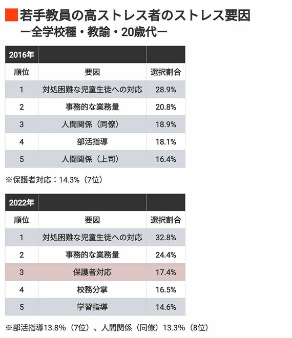 とりわけここ数年休職者の増加が大きいのは20代、30代の比較的若手なのだが、20代、30代の教員のうち、高ストレス者の要因としては「対処困難な児童生徒への対応」「事務的な業務量」に加えて、「保護者対応」が上っている(ストレス要因を回答者が2つまで選択する調査)。