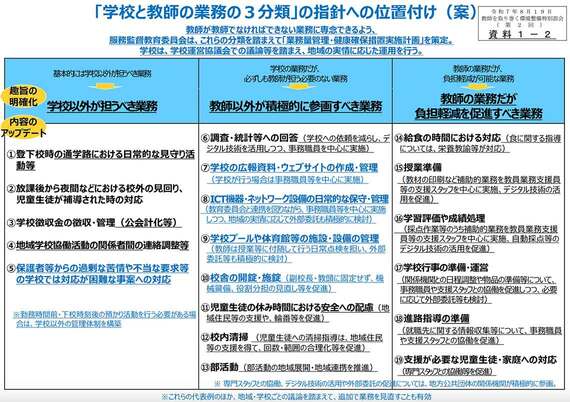 こうした学校現場の大変さは文科省もわかっているようで、直近の中央教育審議会特別部会でも、「保護者等からの過剰な苦情や不当な要求等の学校では対応が困難な事案への対応」については、以下の一番左、「学校以外が担うべき業務」と仕分ける案を示している。