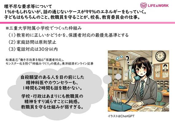 プロは自身を守りつつ、限られた時間でよい対応をすることを目指すべきだし、前述のとおり、教職員は子どもの成長の支援がメインであり、保護者へのケアのプロである必要はない。