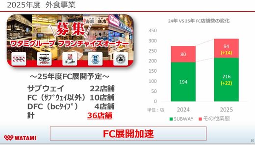 直近の2025年3月期の決算説明会資料にも「FC展開加速」の文字が躍る。ワタミのフライドチキン業態「bb.qオリーブチキンカフェ」も、現在2店舗のFC加盟店がある。