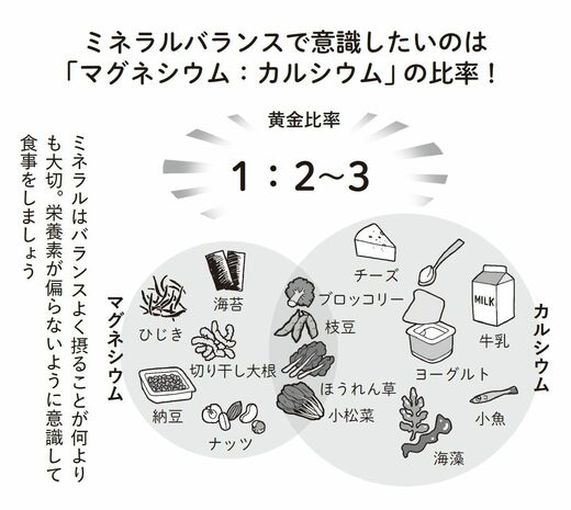 そこで、ミネラルバランスを意識するために目安として覚えておいてほしいのが、「マグネシウム:カルシウム=1:2~3」の理想的な比率です。