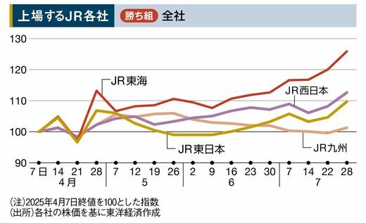 まずJR各社を見てほしい。全社が「勝ち組」であり、中でもJR東海は7月28日終値が4月7日に対して125と大きく上昇。8月15日終値は3892円。2019年最高値(株式分割考慮後で5251円)に向けて、ジワジワと水準を戻しつつある。