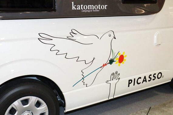 そんなチップトップをベースとするパブロでは、左右のボディサイドにピカソの描いた鳩のアートが施されている。手を差し伸べる人に一輪の花を授けようとしている鳩。ピカソは、平和を愛することで、平和の象徴である「鳩」を多く描いたといわれており、加藤モーターによれば「そうしたピカソの想いと願いを継承」するために、鳩のアートを取り入れたという。外観では、ほかにも「PICASSO」のロゴをルーフ部など各所に配置。このモデルがピカソのアートとコラボした特別なキャンピングカーであることを強調するギミックも施している。