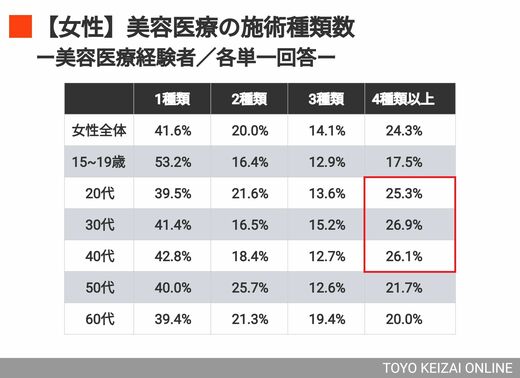 『美容医療の施術種類数』の調査では、20〜40代の女性の25%以上が「4種類以上の美容施術を経験したことがある」と回答した。