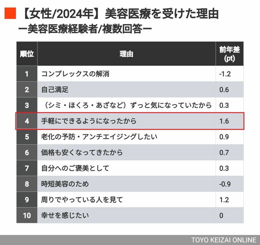 『美容施術を受けた理由』として最も多く挙げられたのは「コンプレックスの解消」、次いで「自己満足」という結果だった。女性においては「手軽にできるようになったから」が前年からの増加幅が最も大きく、特に40代以上で高いスコアを示している。