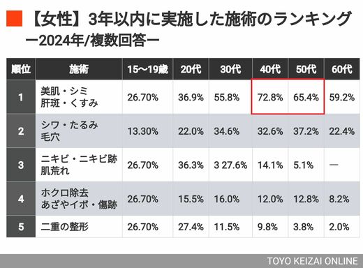 女性1位にランクインした『美肌・シミ・肝斑・くすみの治療』に関しては40〜50代の回答率が顕著に高く、アンチエイジング世代の多くの女性が美肌づくりに注力していることがうかがえる。