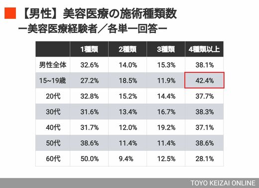 男性においては15〜19歳で同様の回答率が最も高かったことからも、若年層で多様な美容施術を取り入れる人が多いことがうかがえる。
