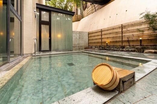 ひと心地ついたら、食事前に大浴場へ向かいます。客室数は25部屋と旅館としては小規模ながら、洗い場も広々としているうえに、大きな浴槽が3つもある贅沢な造りです。室内には熱湯(あつゆ)とジェットバス、屋外には露天風呂もあり、サウナまでついています。