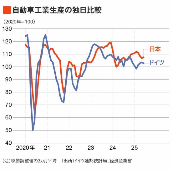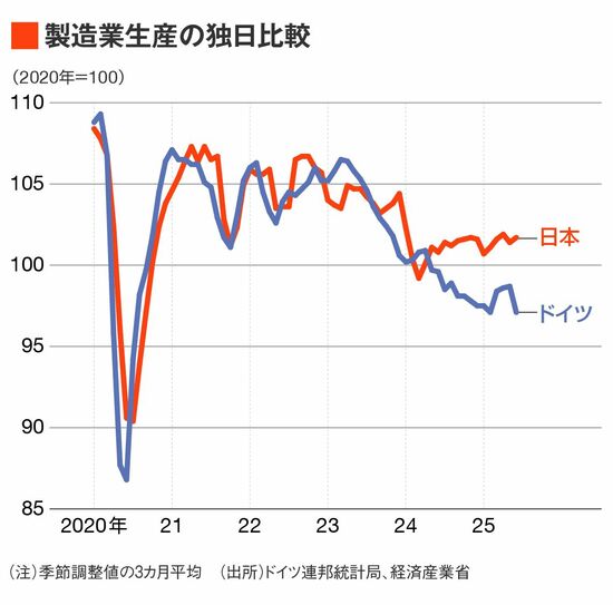 逆を言えば、ドイツの場合、自動車工業は踏ん張ったものの、他の工業が大きく沈んでしまったわけである。ドイツと日本を比較した場合、4〜6月期に関しては、トランプ関税の影響はドイツのほうが強く出たと評価できる。趨勢的にも厳しい状況が続いたドイツの製造業だが、トランプ関税はさらなる打撃となった。