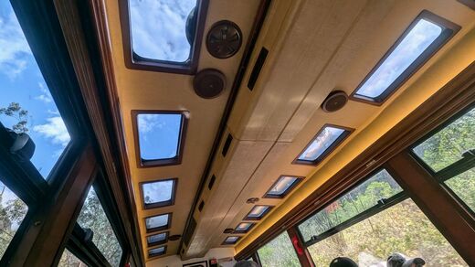行きのペルーレイルの上位クラスのように、テーブル上のランチョンマットや軽食のサービスはないが、大きな窓から外の景色を見られるし、天井にも小ぶりな窓がついていて、旅の雰囲気を十分に味わえる。