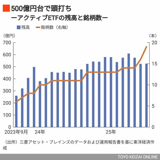 創設から丸2年が経つが、肝心の資金が流入しない。ETF全体の残高は7月末時点で92兆円に上り、過去2年間で約20兆円増えた。だが下図のとおり、アクティブETFに限れば500億円台で伸び悩み、1桁億円の小粒銘柄も散見される。