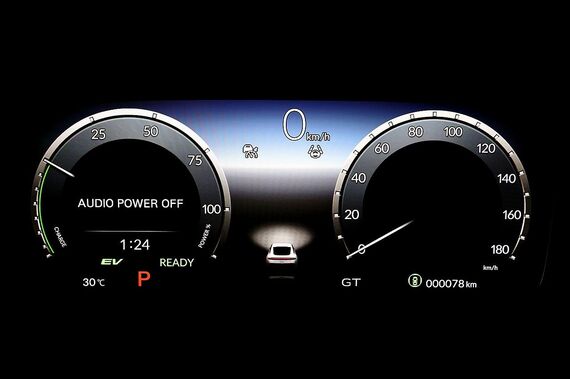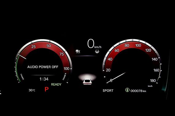 ステアリング右奥にあるパワーボタンを押すと、走行可能な状態となる。バッテリーの充電状況が良好なため、エンジンは始動しない。まずは、通常のハイブリッド仕様であるベースコントロールの状態で走行してみる。