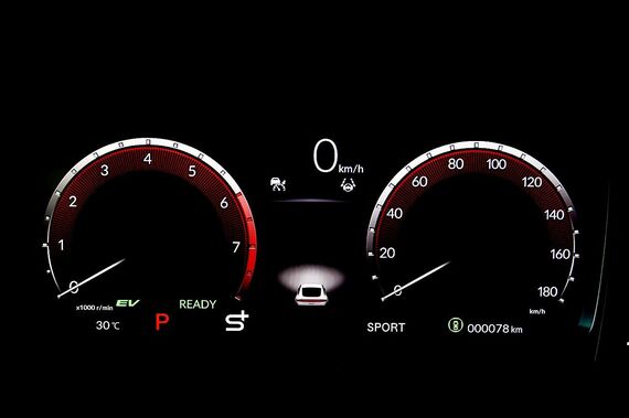 通常のベースコントロール時、2連メーターの左側には「パワーメーター」を表示する。加速時にはモーターで車両を駆動する出力などを、減速時にはバッテリーへの回生充電の状況を視覚的に表示するもので、近年のホンダ製ハイブリッド車に多く設定されている表示方法だ。それがS+シフトにすると、実エンジン回転数を表示する「タコメーター」に切り替わる。アクセルペダルを踏み込みながら、エンジン回転の上昇などを視覚的にも楽しむことを可能としている。