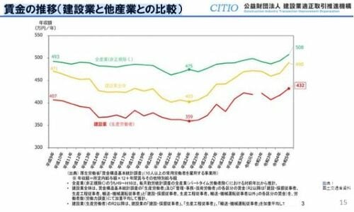前年度実績に基づいて算定される公共工事設計労務単価は、1999年度を100として2000年度は87.5に落ち込み、その後も12年連続で下がって2012年度には70.3まで低下した。その影響で建設業の賃金低下が進み、2012年度には全産業の平均年収475万円に対して建設業は72万円少ない403万円、建設技能労働者は116万円少ない359万円となった。