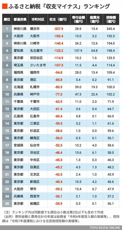 ライフ ふるさと納税「収支マイナス」自治体ランキング 9月で終了のふるさと納税ポイント還元『2024年度トップの横浜市は327億円の流出』 2分で読める 公開日時:2025/09/20 05:15 田中 久貴 東洋経済データ事業局 フォロー 1/9 PAGES 2/9 PAGES 1~25位は? 次ページが続きます:【26~50位は?】 3/9 PAGES 4/9 PAGES 5/9 PAGES 6/9 PAGES 7/9 PAGES 8/9 PAGES 9/9 PAGES