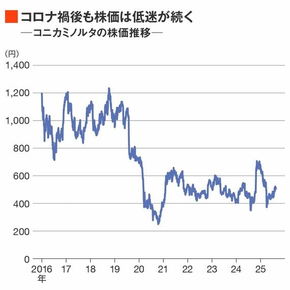 コロナ禍前の2019年に5000億円程度だった時価総額は、足元は2600億円に沈む。オフィス向けA3複合機の市場では世界シェア4位を占める中堅メーカーは、苦境に立たされている。