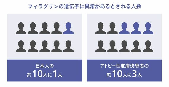 冬になると肌がとても乾燥する方々がいらっしゃいますが、実は日本人の約1割にフィラグリンの遺伝子の異常があるといわれています(※3)。また、約160万人(※4)のアトピー性皮膚炎の患者さんの約3割にフィラグリンの遺伝子の異常がある(※5)ため、湿疹(しっしん)によるかゆみに加えて、乾燥によるかゆみが生じやすくなります。