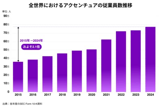 コンサル側の人材需要も旺盛だ。アクセンチュアの従業員数はこの10年で約2.1倍に増え、いまや世界で77万人を超える規模に。Big4と呼ばれるデロイト、PwC、EY、KPMGも同様に人員を拡大しており、採用の裾野はますます広がっている。