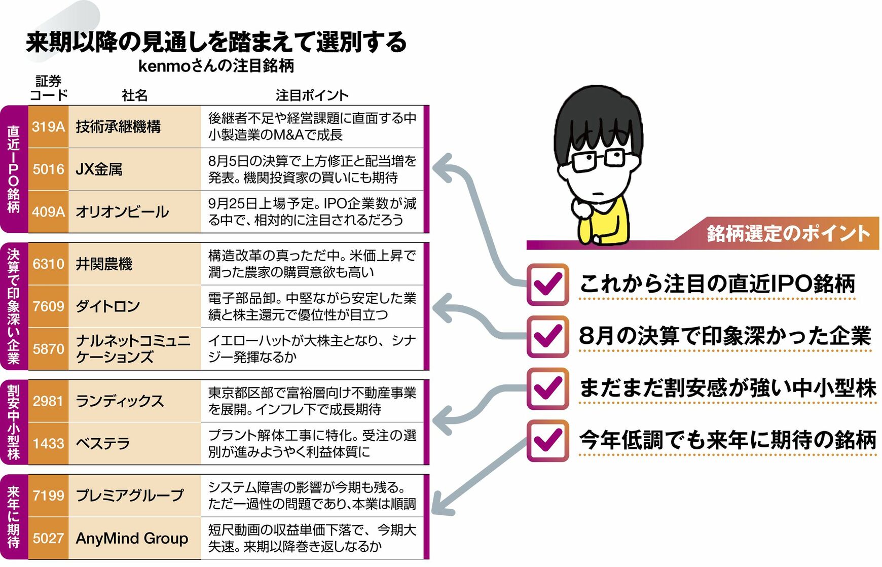 1つ目は、今後注目したい直近IPO(新規株式公開)銘柄だ。まずは、東証グロースの技術承継機構。後継者不足や事業承継に悩む中小製造業をM&A(合併・買収)によってグループ化して成長してきた。少子高齢化が進む日本での需要は強いと思われ、市場の評価が一段と高まる可能性がある。