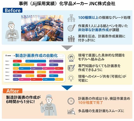 山城 製薬や製造、物流に関する企業からのニーズが高いです。例えば、化学品メーカー・JNC様の事例では、化学材料の製造計画表の作成を自動化し、作業時間を6時間から1分に短縮できました。専門知識がなくても製造計画表を作れるようになったほか、多品種の生産計画策定もスムーズになったといいます。