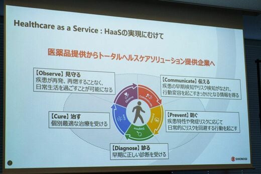 HaaSとは何か。薬を売って終わりではなく、診断・予防・治療・予後管理まで患者の健康管理全体をサービスとして継続的に提供し、そこから収益を得るモデルだ。三春氏は「治療薬だけでなく診断・予防・日常生活といった広い場面において価値提供」を目指すと語る。