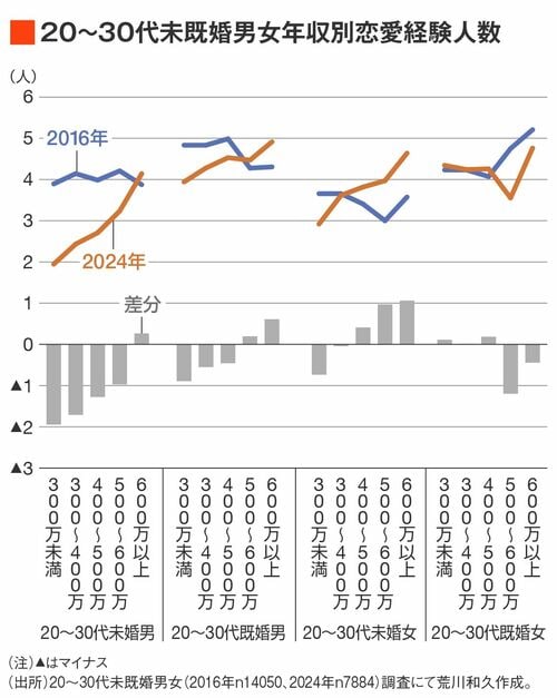 私のラボで調査した個人年収別の恋愛経験人数の推移(対象は20〜30代未既婚男女)を2016年と2024年とで比較したものが以下です。