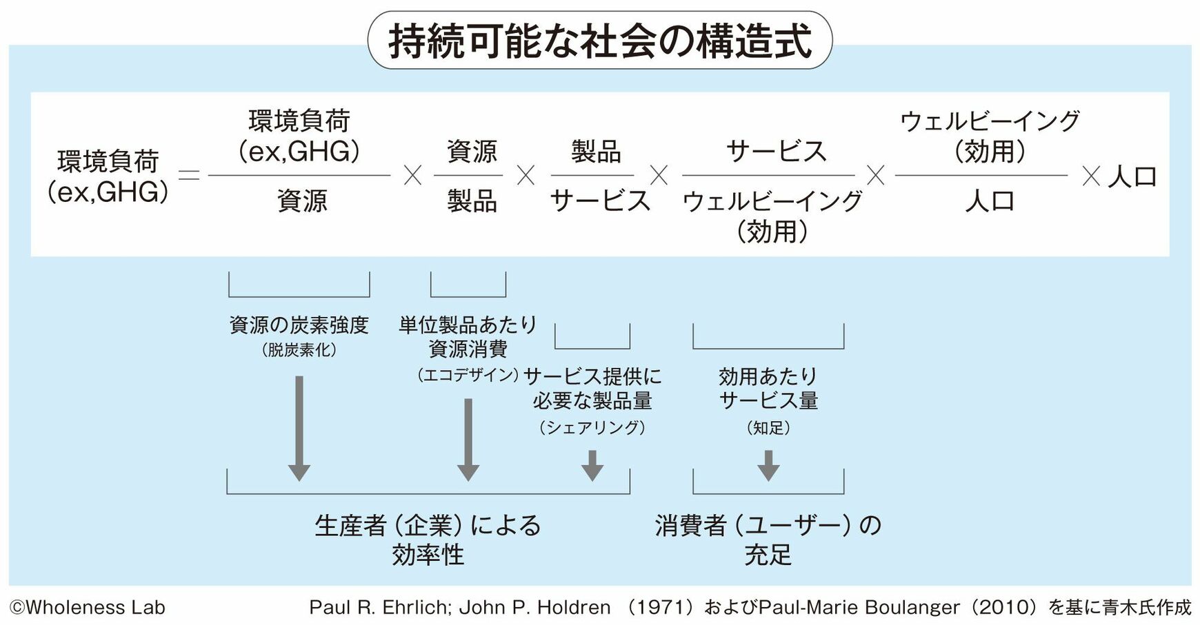 青木 そのとおりです。下の図表「持続可能な社会の構造式」は、ビジネスと社会構造に焦点を当て(縦軸とし)、環境負荷を構成する項目を独自にまとめたものです。