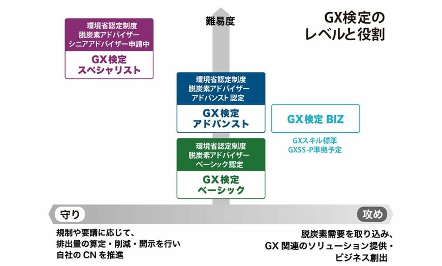 「GX検定BIZ」は前述したGXSSレベル2に相当しており、脱炭素需要を取り込み、GX関連のソリューション提供・ビジネス創出を担う、いわば「攻め」のGX人材であることを証明するものだ。