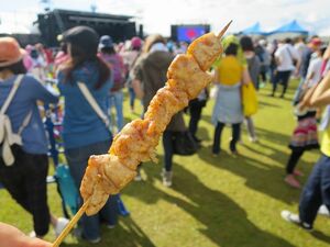 そんな野外フェスにおいて、音楽以外で重要となるのが「グルメブース」だ。大勢の来場者が飲まず食わずで長い時間楽しめるワケはなく、さまざまな露店が出店する。たこ焼きなど画一的な料理は相対的には少なく、むしろ地元の食材やご当地グルメを全面に押し出すケースが目立つ。