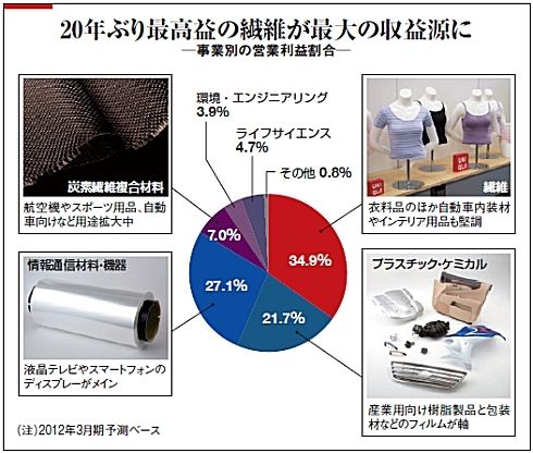 11年の東レの合繊生産量は、インドや中国の企業に及ばず世界10位にすぎないが、売上金額ではトップに立つ。糸売りにとどまらず、テキスタイルや縫製など、繊維素材を加工し、付加価値を高めることを実現しているからだ。
