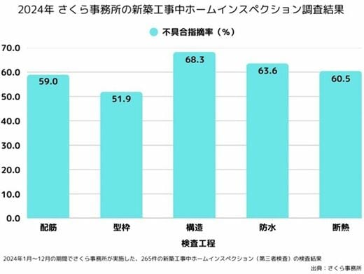 盲点になりやすいのが、建物の「施工品質」だ。設計上は断熱性能が高かったとしても、その性能を発揮できる施工が伴っていなければ「涼しい家」にはならない。2024年に弊社が実施した”新築工事中”ホームインスペクションでは、実に60.5%の住宅で断熱施工における何らかの不備・不具合が見つかっている。