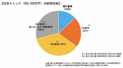 既存住宅のうち省エネ基準に適合している住宅は、2019年時点でわずか1割強。約3割の住宅は無断熱といわれているが、断熱性能はリフォームで向上させることもできる。