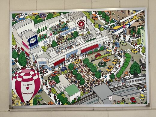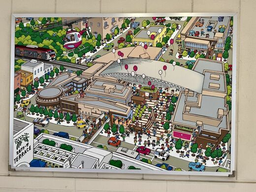 「たまプラーザ テラス」には、1982年の「たまプラーザ東急ショッピングセンター」と、2010年の「たまプラーザ テラス」のイラストが並んで飾られている。