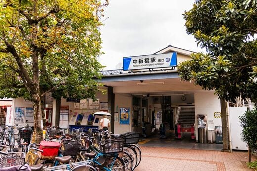 大山駅とはうってかわって静謐(せいひつ)な中板橋駅の南口。下り線ホームに近い小さな駅舎の前は駐輪場(撮影:鼠入昌史)