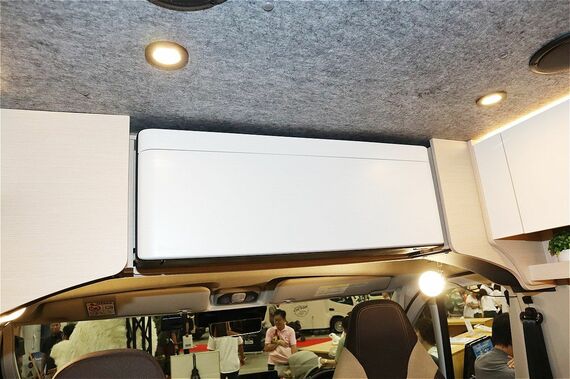 さらに、オプションにも充実のアイテムを用意。なかでも、家庭用エアコンは、運転席の上に配置する設定で、ほかの家具類の位置を邪魔しないことと、冷気が前方から後方まで効率よく通る工夫も施している。