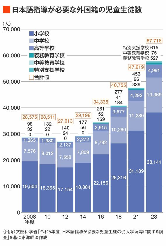 文部科学省の「令和5年度 日本語指導が必要な児童生徒の受入状況等に関する調査」によると、2023年度における日本語指導が必要な外国籍の児童生徒数は5万7718人で、2021年度の前回調査時より約1万人増加している。これらの児童生徒が存在する学校数も9932校と約1500校増加しており、学校現場での日本語指導のニーズが高まっていることが読み取れる。