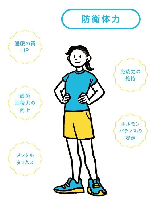 一方、防衛体力とは、外からのストレスやウイルスに負けないための「内なる体力」です。見た目ではわかりにくいのですが、「最近調子がいいな」「風邪をひかなくなったな」「よく眠れるようになったな」といった日常の〝快調感〞に大きく関わってきます。ストレスに強い、疲労回復が早い、メンタルが安定している……これらも防衛体力の一部です。