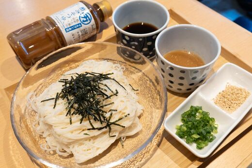同店では、「特級(黒帯)」「縒(より)つむぎ」「上級(赤帯)」といった揖保乃糸を、その日の仕入れによって提供している。「特級」は、ギフト用として扱われることが多い。運がよければ、専用倉庫で1年寝かせた「古(ひね)」に出会えることもある。どの等級のそうめんが食べられるかは、訪れてのお楽しみというわけだ。