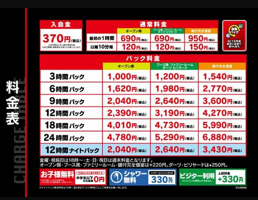土日祝日と金曜祝前日18時からは週末料金となり、プラス220円ほど加算される。また初回利用時は入会金として370円が必要となる(すべて税込価格)。なお料金体系は利用者にとって最適なプランに自動で切り替わるため、利用者が入店時に「始発までの時間潰しが目的なので6時間パックにしようかな」といった選択をする必要はない。
